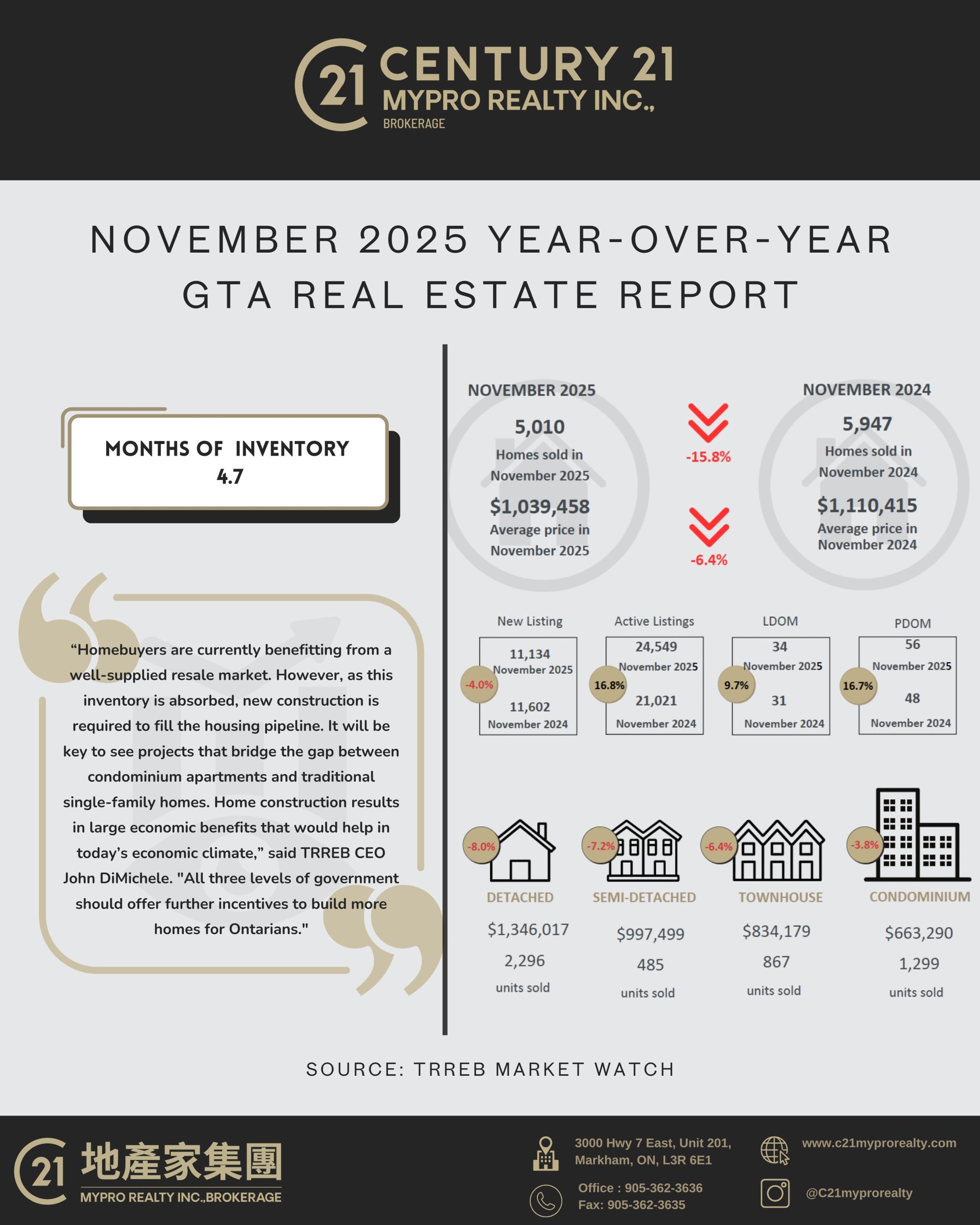 As we approach the winter market, activity continues to stabilize across the GTA. November showed softer sales and pricing compared to last year, while inventory remained high — giving buyers more options and negotiating power.